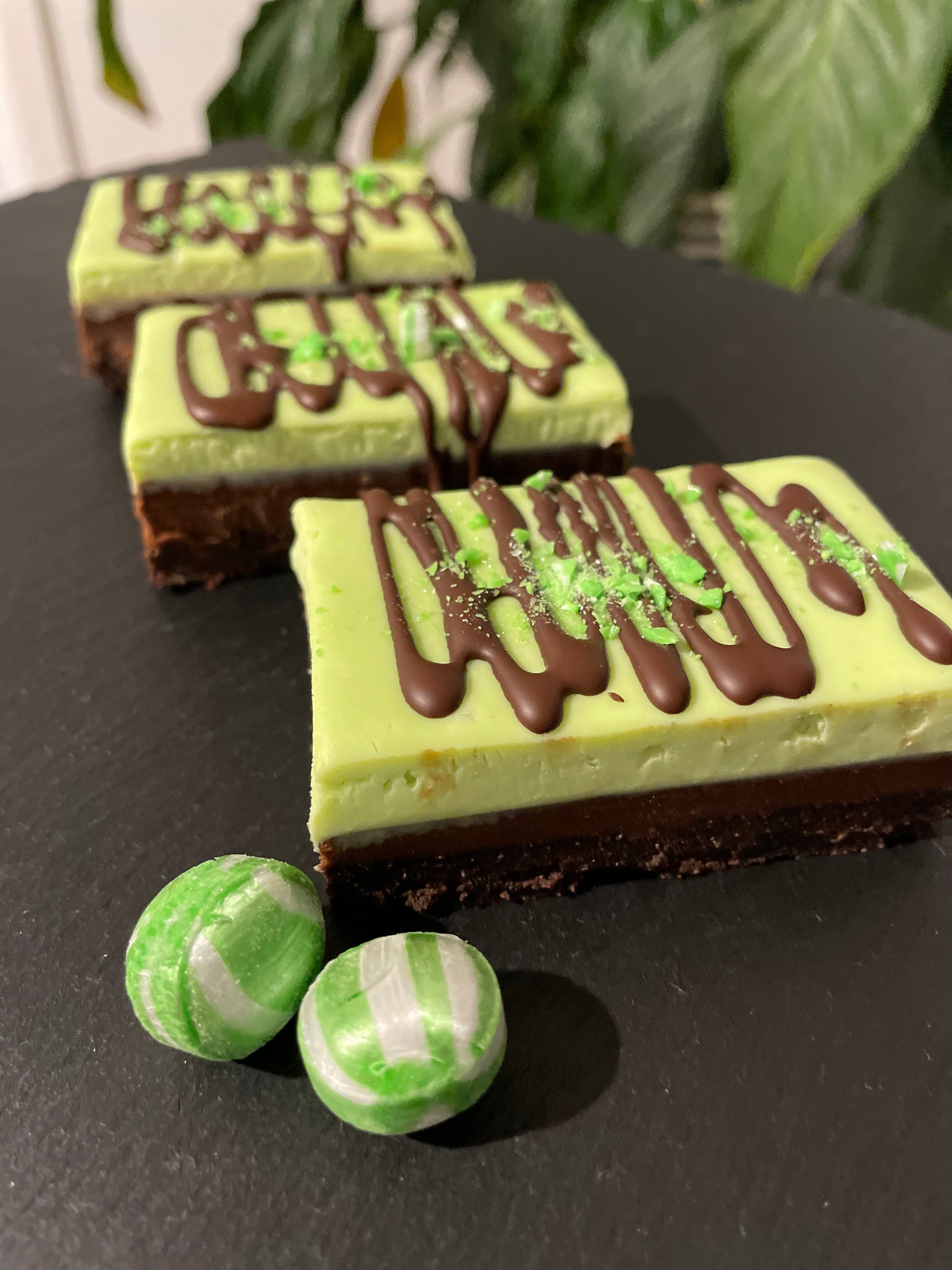 Mint chocolate fudge, peppermint crème, topped with dark chocolate and sugar free spearmint crumb